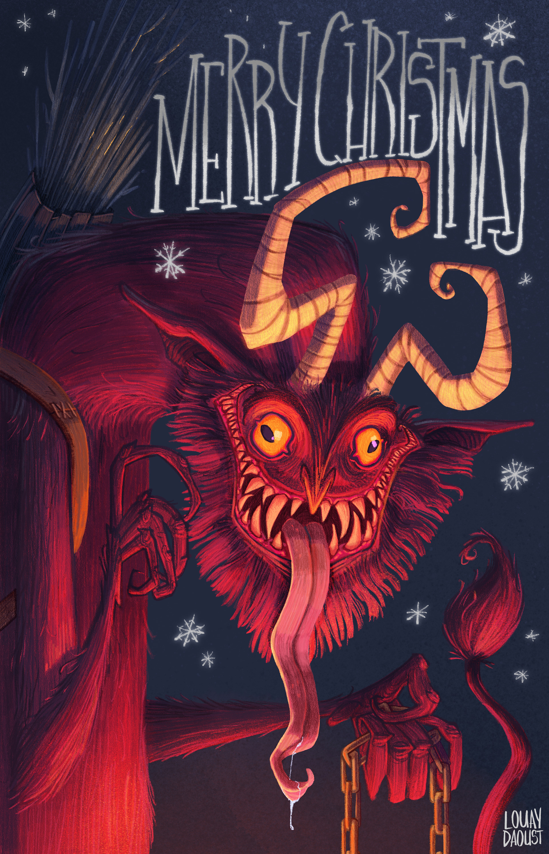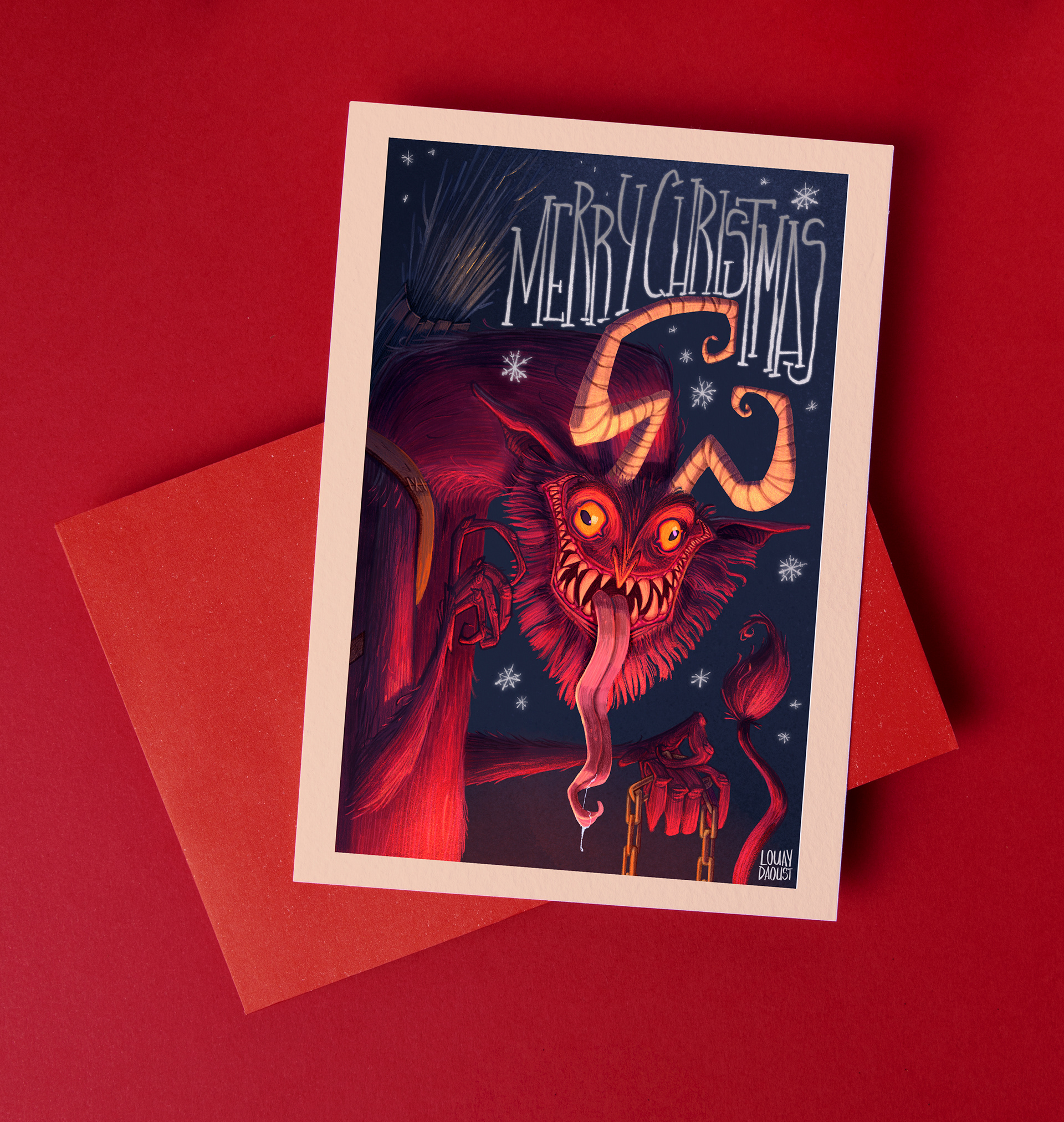Christmas Card illustration featuring Krampus, a figure in the Central and EasternĀ AlpineĀ folkloric tradition.